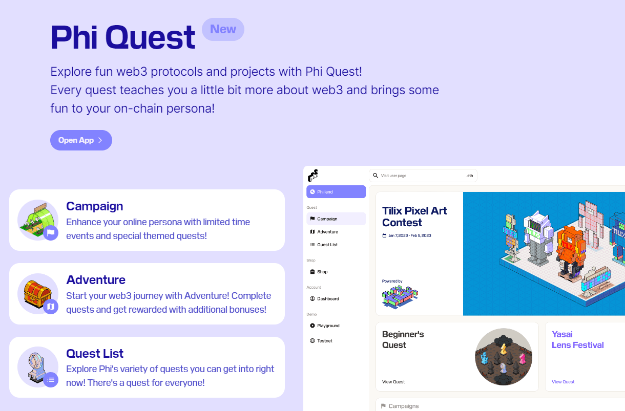 PhiLand apresenta as Phi Quests, um elemento central da gameplay onde os players embarcam em diversas missões. Essas quests vão desde tarefas introdutórias simples até desafios mais complexos, cada uma projetada para aprofundar o engajamento do player com os protocolos Web3. Completar essas quests recompensa os players com NFTs voxel exclusivos, que podem ser exibidos em seus Phi Lands.