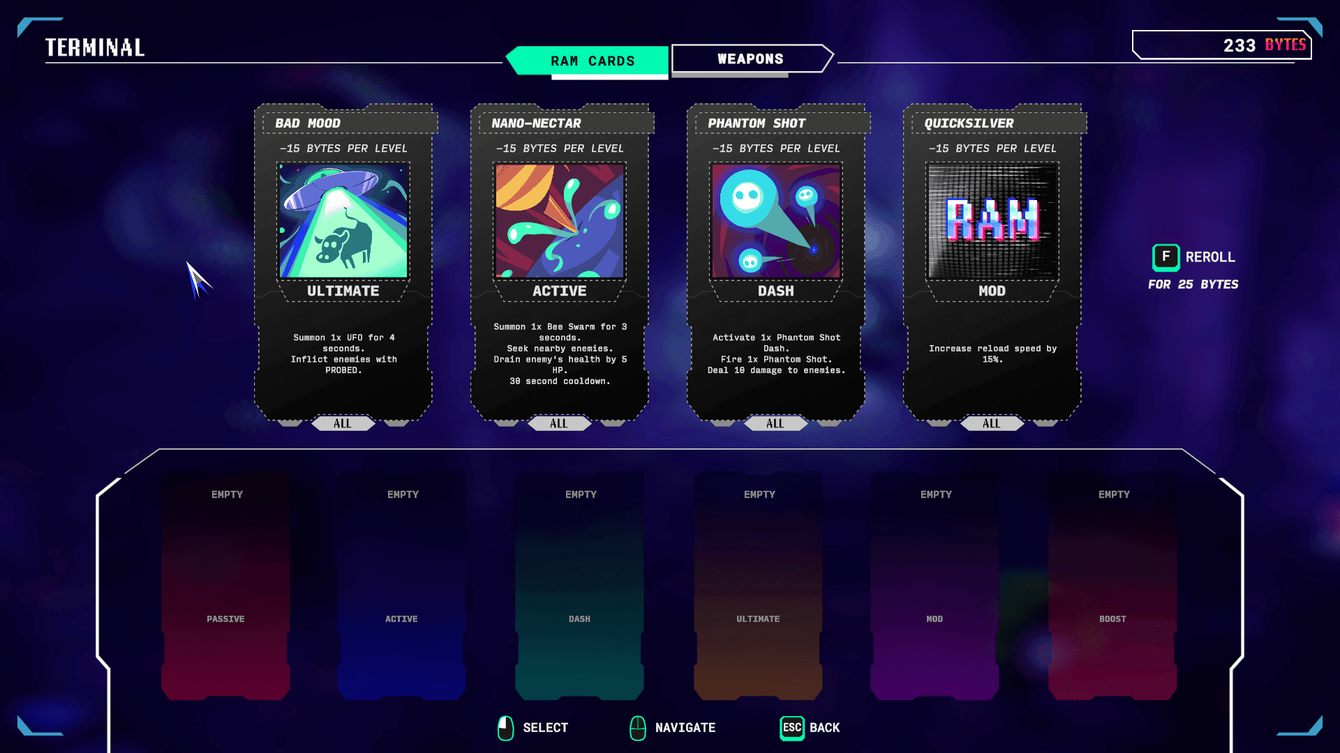 Os RAM Cards funcionam como modificadores de habilidade e upgrade. O jogo atualmente apresenta 40 RAM cards em categorias como Passivo, Ativo, Ultimate, Dash, Mod e Boost. Esses cards fornecem benefícios que vão desde cura e camuflagem até o posicionamento de torres ou o aprimoramento de dano corpo a corpo. Cada "run" permite que os jogadores montem um deck de RAM cards, criando diferentes estratégias dependendo dos inimigos e planetas enfrentados.