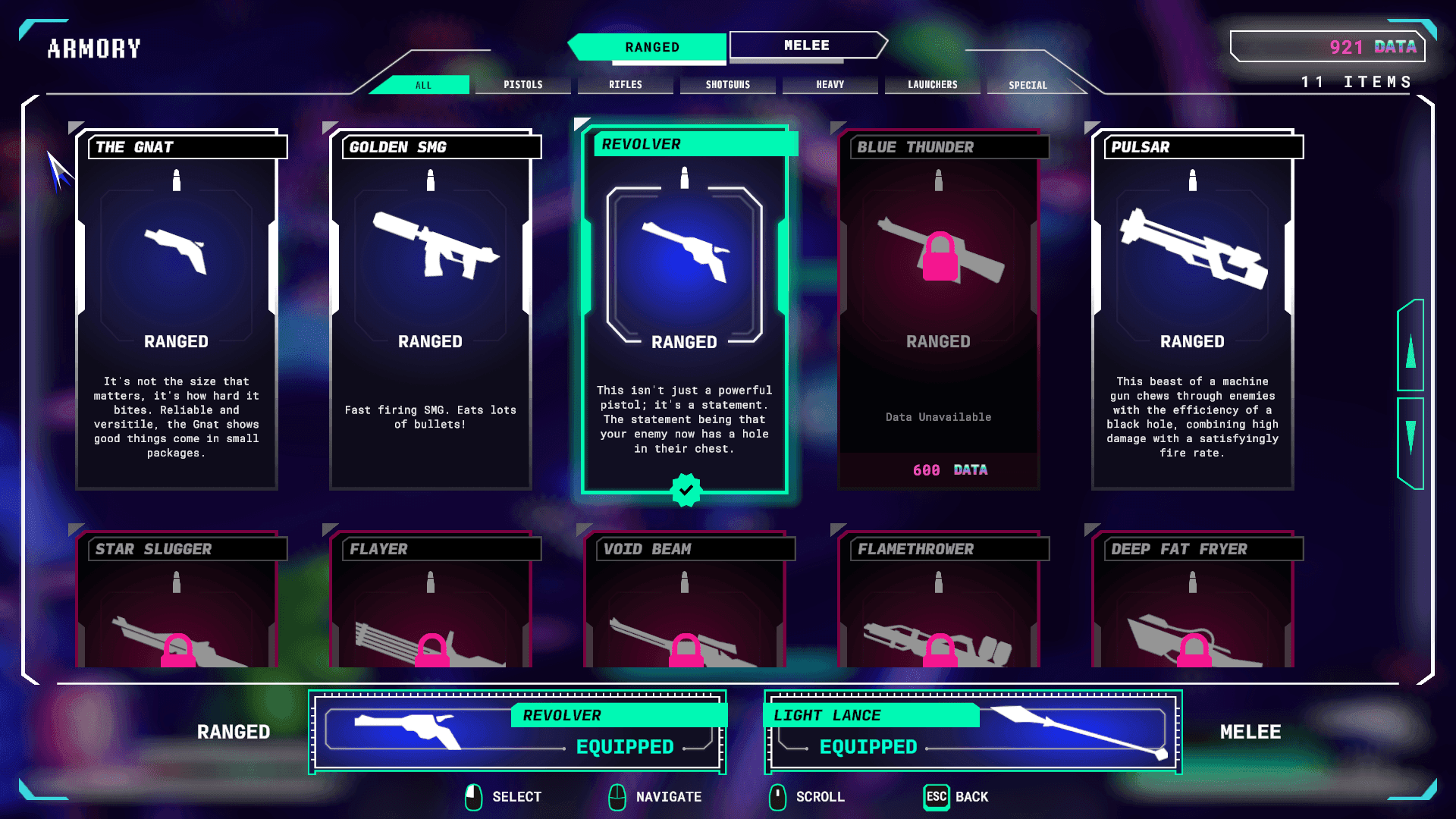 As armas abrangem pistolas, rifles, espingardas, armas pesadas, lançadores, especiais e opções de combate corpo a corpo. Cada classe de arma oferece diferentes papéis, desde a confiável pistola Gnat até armas pesadas de alto dano como o Deep Fat Fryer. A variedade incentiva os jogadores a experimentar e encontrar builds que se adequem ao seu estilo.