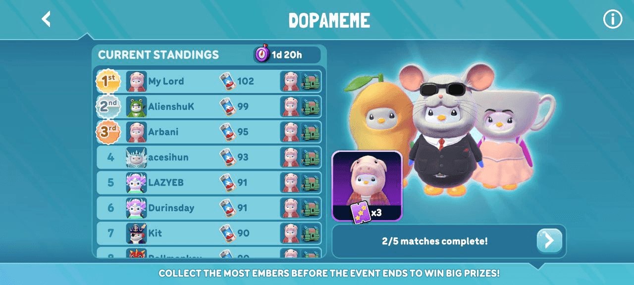 Pudgy Party features rotating seasonal events, starting with Season 1: Dopameme Rush. These events bring in limited-time challenges, themed cosmetics, and bonus rewards that cannot be earned once the season ends. For this first season, players can unlock meme-inspired costumes like Tung Tung Sahur, Ballerina Cappucina, and John Pork, all tied to the event’s Brainrot theme.