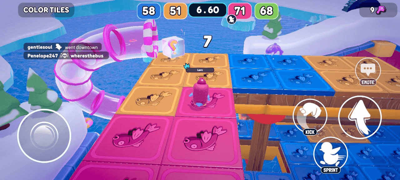 The match begins the moment you tap the play button from the main menu. You are placed into a lobby with up to twenty other penguins, all of them real players waiting for the chaos to begin. Once the countdown ends, the game selects the first challenge, and the race for survival is on.