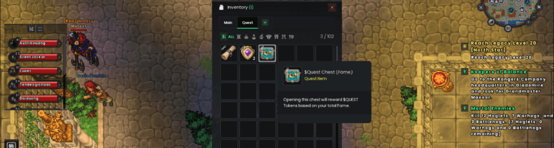 - Check Your Inventory Your total $QUEST balance will be updated and shown in your in-game wallet. But before you can withdraw it to your wallet, there’s one more step.