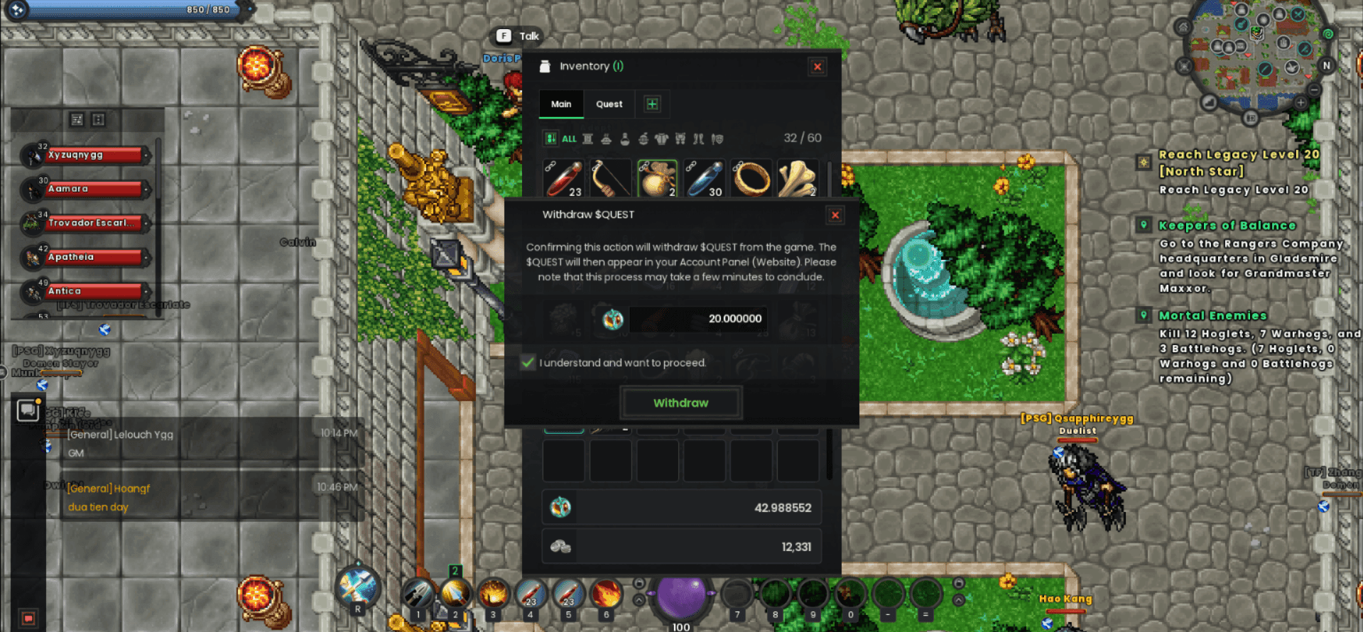 - Withdraw to Website Balance. Open your in-game inventory and click on your $QUEST tokens. A prompt will ask how much you want to withdraw. Confirm the amount, and the tokens will be moved from your game account to your Website Balance.