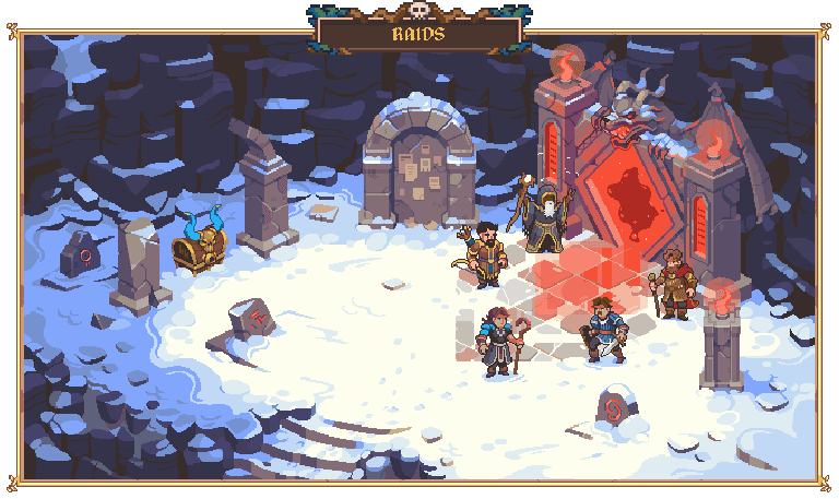 เกมนี้มีดันเจี้ยน (dungeon) ที่มีความยากเพิ่มขึ้นเรื่อยๆ โดยแต่ละแห่งมีบอส (boss) ตารางไอเท็ม (loot table) และความเสี่ยงที่แตกต่างกันไป เมื่อผู้เล่นก้าวหน้าในเกม พวกเขาสามารถเข้าสู่ดันเจี้ยน (dungeon) ที่ยากขึ้นซึ่งให้รางวัลที่สูงขึ้น แต่ต้องใช้นักผจญภัย (adventurer) ที่ทรงพลังกว่าในการพิชิต