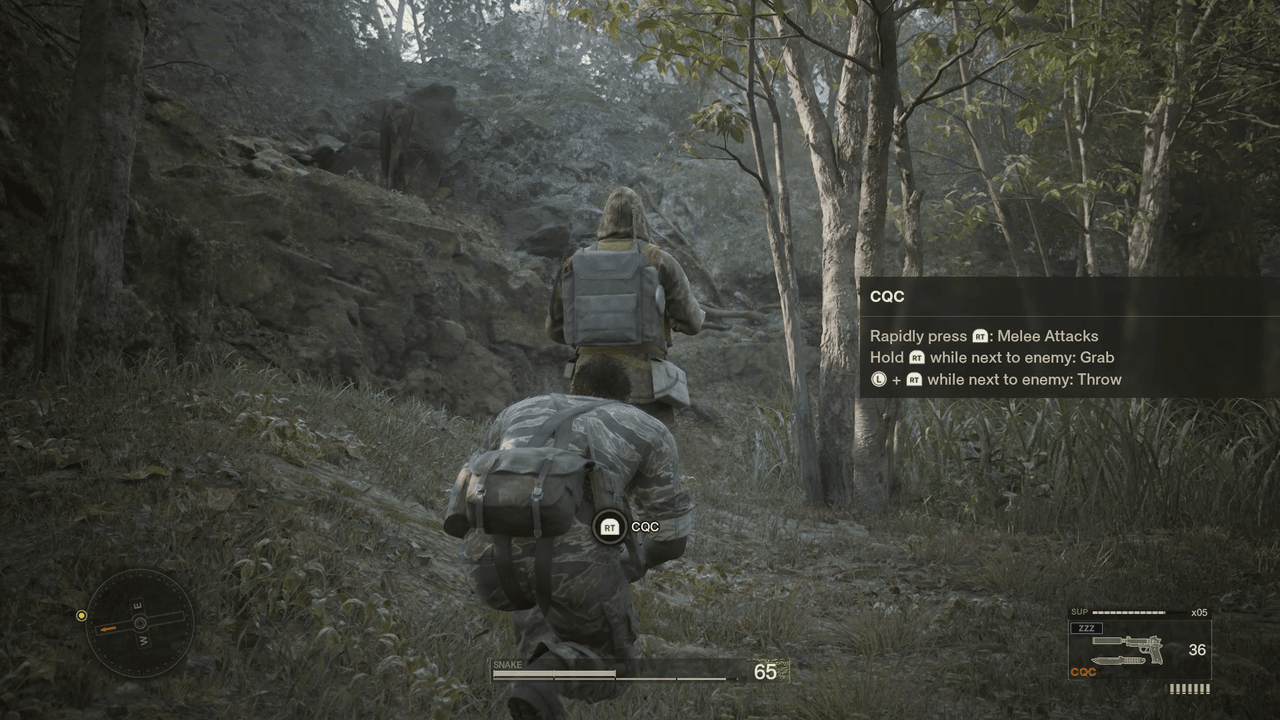 Düşmanların yakınındayken CQC başlatmak için R2 tuşunu basılı tutun. Kuşanılmış silahınız, mevcut eylemleri belirler: