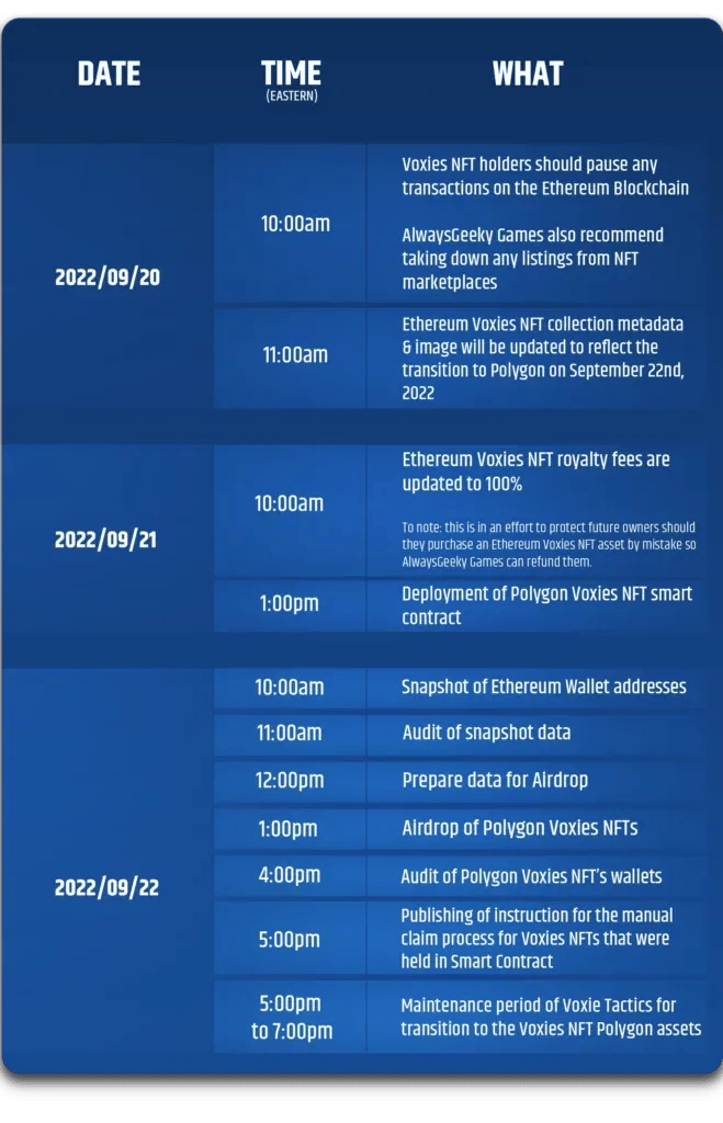 AlwaysGeeky Games ekibi, geçişin gerçekleşeceği 20 Eylül ile sürecin sona ereceği 22 Eylül arasında neler olacağına dair ayrıntılı bir açıklama paylaştı. Doğu Saati ile sabah 10'dan itibaren, tüm Voxie Tactics NFT sahiplerine tüm alım satım işlemlerini durdurmaları ve hatta tercihen aktif listelemelerini kaldırmaları talimatı verildi. Bundan sonra, ekip 21 Eylül Doğu Saati ile öğleden sonra 1'de Polygon Voxies NFT contract'larını devreye alacak. Bu işlem tamamlandıktan sonra, kullanıcılar 22 Eylül Doğu Saati ile sabah 10'daki snapshot'ın ardından Ethereum'da tuttukları aynı asset'leri Polygon üzerinde alacaklar.