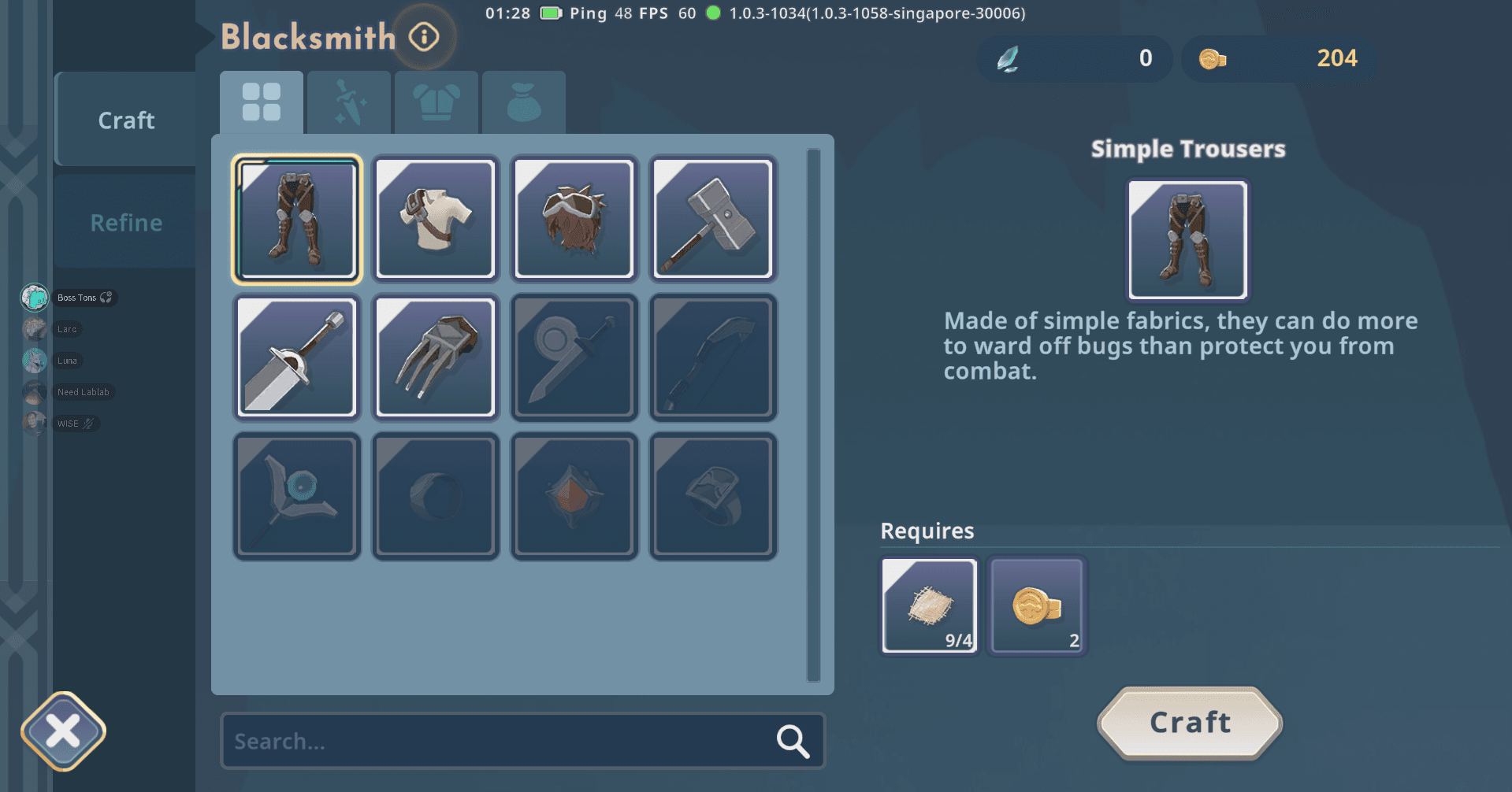 - Chestplate: 2x Fiber, 3x Iron Ore, 2x Coins