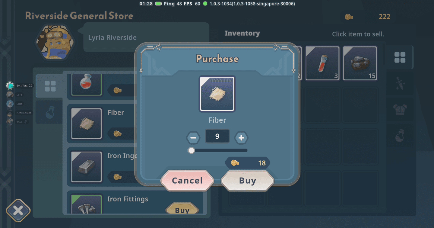 Return to the Main Town, the same area where you initially spawned. At the center of town, you will find the Market and Shop. Upon reaching the shop, purchase at least 9 pieces of Fiber. It is inexpensive and will not heavily impact your coin reserves.