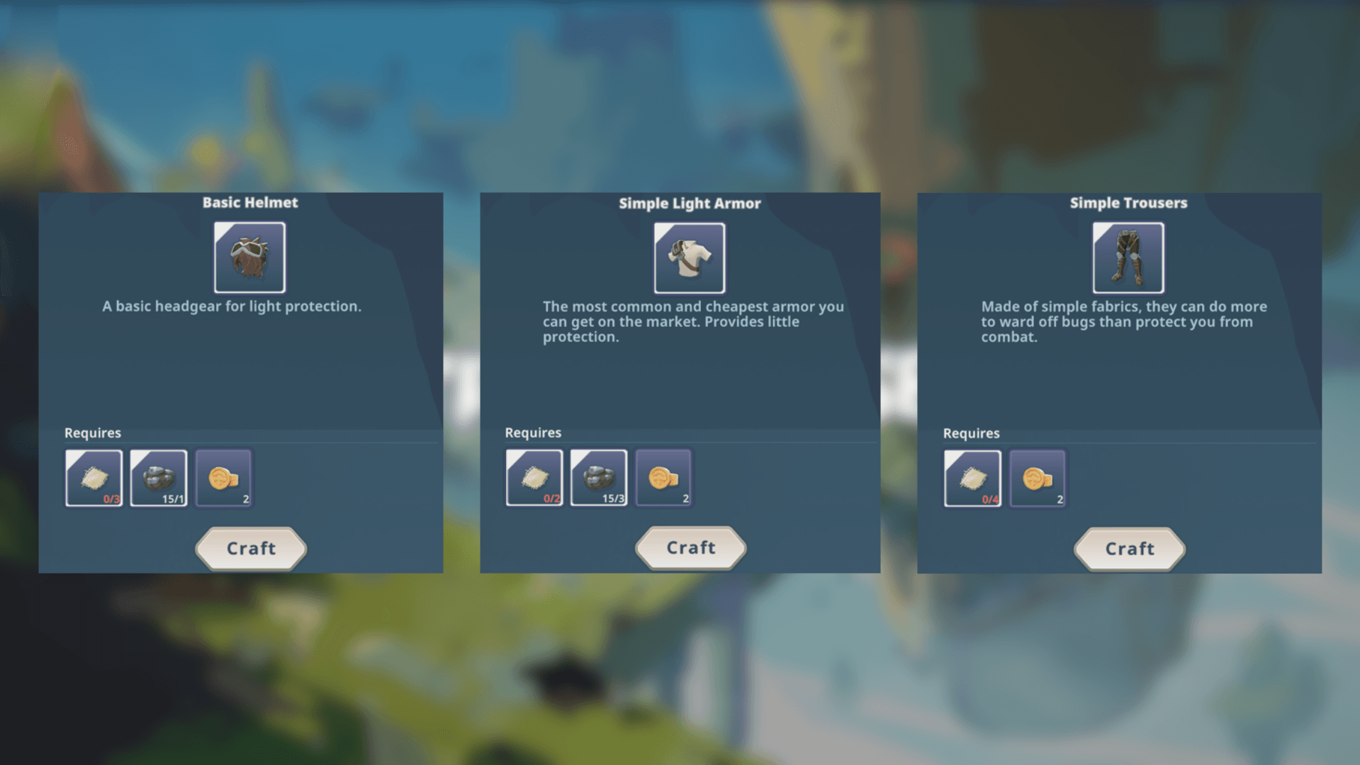 - Helmet: 3x Fiber, 1x Iron Ore, 2x Coins