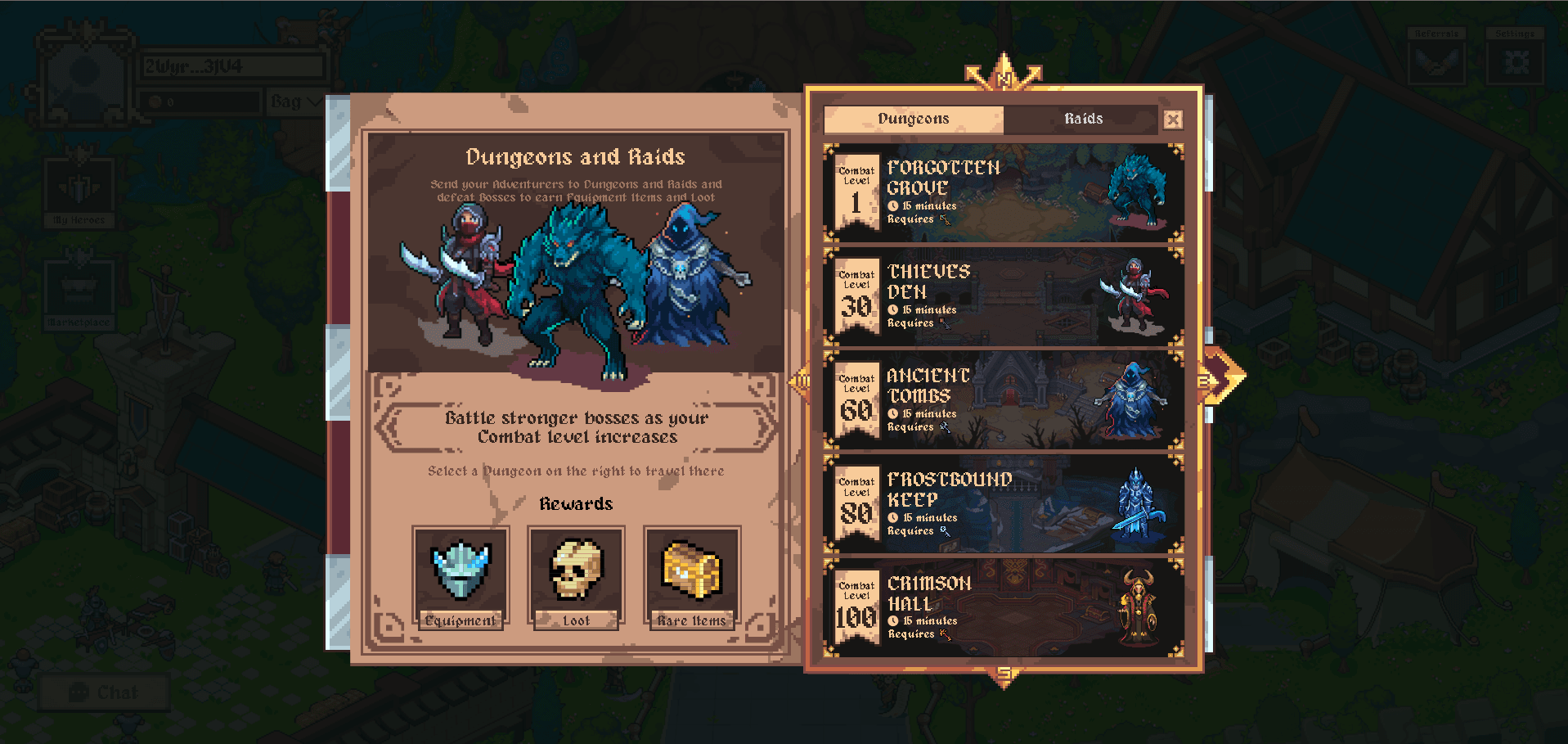 ایک بار جب آپ کو اپنی dungeon key مل جائے، تو DeFi Dungeons کے دل میں غوطہ لگانے کا وقت آ گیا ہے—یعنی اصل dungeon raids۔ یہ سادہ، سیدھے چیلنجز نہیں ہیں؛ dungeon کا لیول جتنا زیادہ ہوگا، اس میں شامل خطرات اتنے ہی زیادہ ہوں گے۔ آپ جتنا اوپر جائیں گے، اتنا ہی زیادہ خطرہ مول لیں گے۔ کچھ dungeons میں تو آپ کا قیمتی سامان بھی ضائع ہو سکتا ہے اگر آپ محتاط نہ ہوں۔ ہر dungeon میں ایک تجویز کردہ combat level اور آپ کے کردار کے stats اور صلاحیتوں کی بنیاد پر مختلف انعامات ہوں گے۔