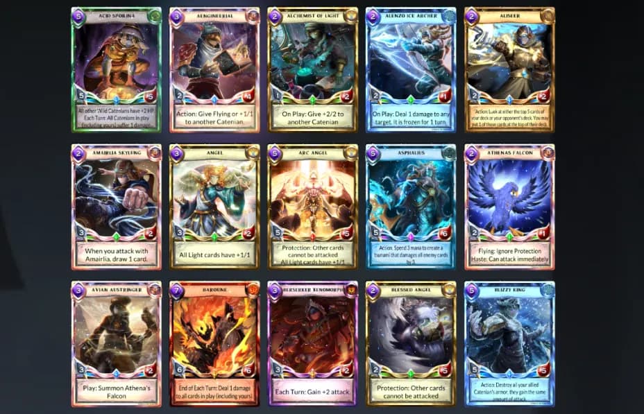 Catenians آپ کی فوج ہیں۔ یہ بلانے کے قابل یونٹس ہیں جو آپ کے ہیرو کے ساتھ لڑتے ہیں، ہر ایک اپنی اپنی خصوصیات اور صلاحیتوں کے ساتھ۔ کچھ کے On Play اثرات ہوتے ہیں (جب بلایا جاتا ہے تو متحرک ہوتے ہیں)، On Death صلاحیتیں (جب تباہ ہوتے ہیں تو فعال ہوتی ہیں)، یا Protection اثرات (دوسروں کو حملہ کرنے سے روکتے ہیں)۔ یہ جاننا کہ کون سے Catenians کو کب کھیلنا ہے اور انہیں جنگ میں کب ٹریڈ کرنا ہے، گیم کی حکمت عملی کا ایک بڑا حصہ ہے۔