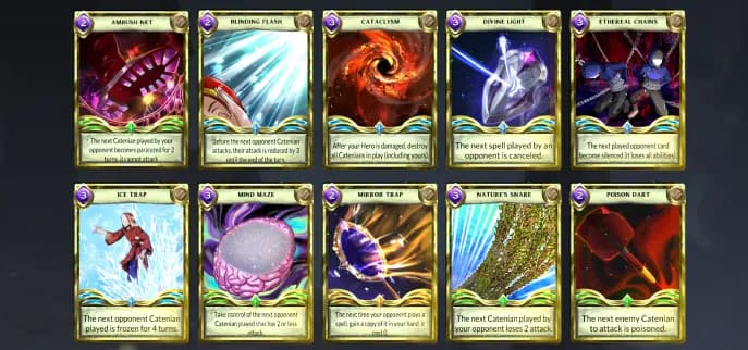 Traps چھپے ہوئے، تاخیر سے اثر انداز ہونے والے کارڈز ہیں جو ایک ٹریگر کی شرط پوری ہونے کے بعد فعال ہوتے ہیں۔ وہ Hearthstone کے secrets کی طرح کام کرتے ہیں لیکن ان میں زیادہ تنوع ہوتا ہے۔ کچھ دشمن کے حملہ آوروں کو منجمد کر دیتے ہیں، انہیں ایک باری چھوڑنے پر مجبور کرتے ہیں، جبکہ دیگر نقصان کو واپس پلٹاتے ہیں، اضافی یونٹس بلاتے ہیں، یا دشمن کے اسپیلز کا مقابلہ کرتے ہیں۔ ایک اچھی طرح سے رکھا گیا ٹریپ مخالف کی باری کو مکمل طور پر تباہ کر سکتا ہے اگر وہ اسے آتے ہوئے نہ دیکھیں۔