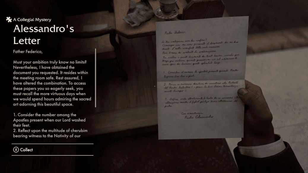 Đi đến bàn phía tây trong căn phòng này và tương tác với lá thư đặt ở đó. Tài liệu này chính thức bắt đầu Collegial Mystery và cung cấp manh mối đầu tiên của bạn về nội dung của két sắt.
