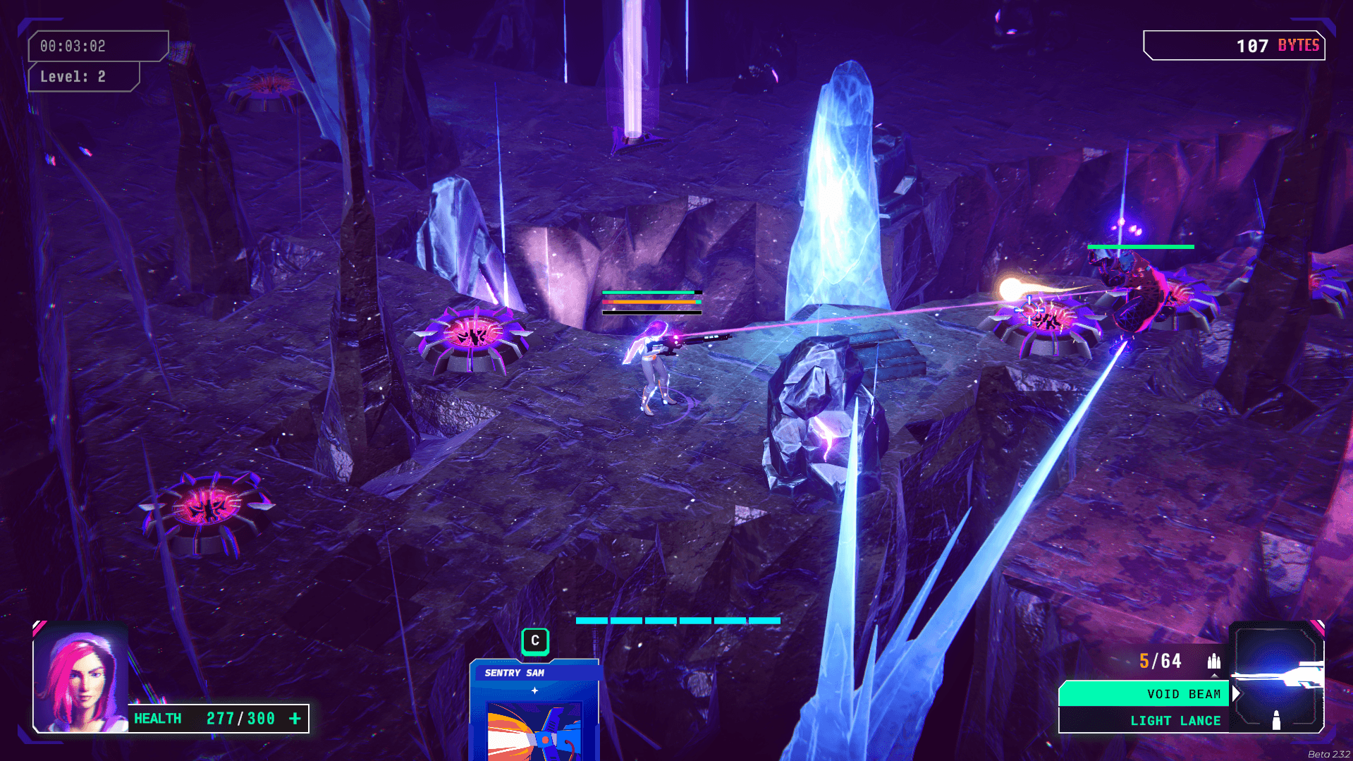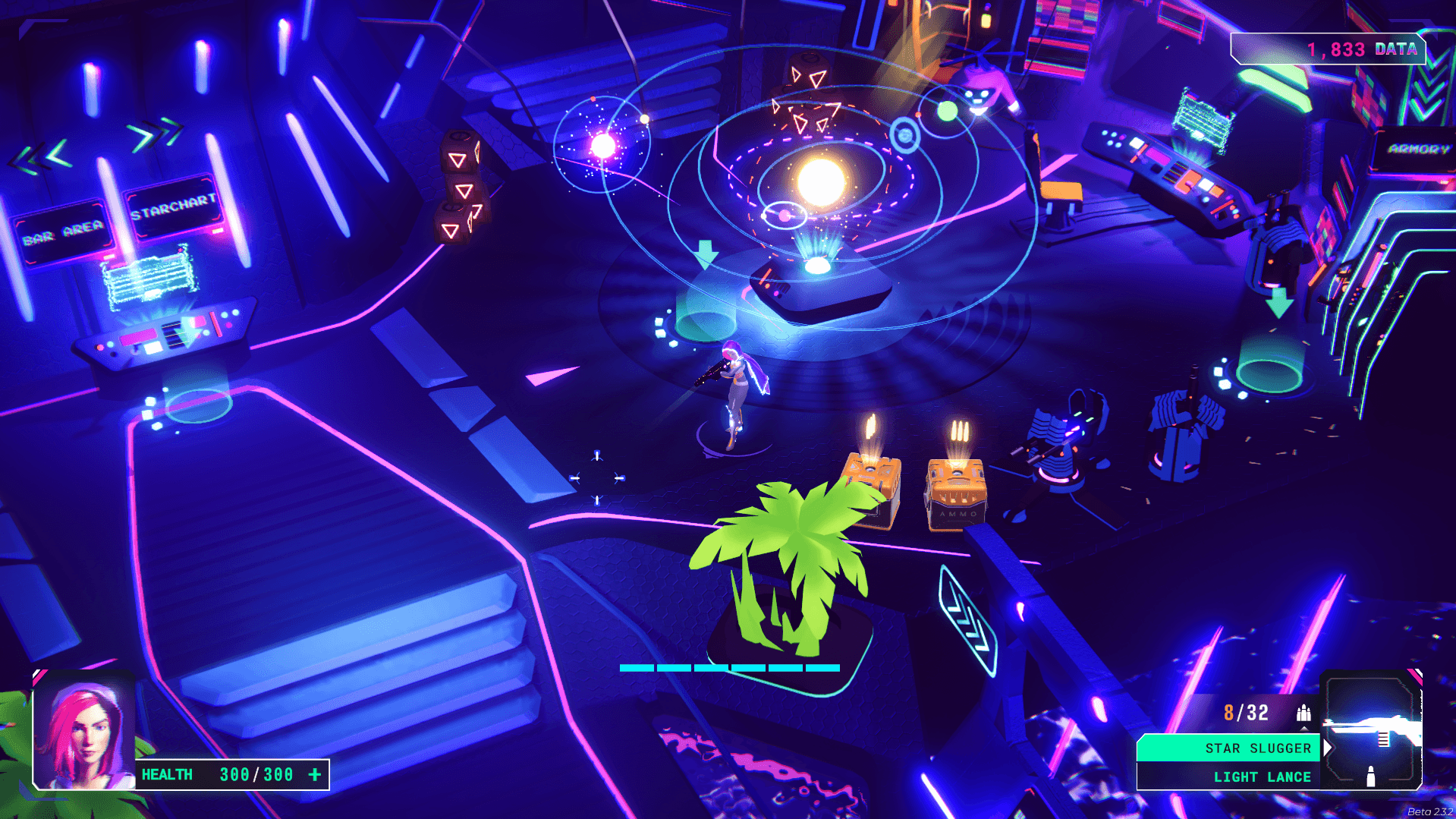 Once you’re all set, you’ll be sent into a neon-drenched, cyberpunk-themed dungeon where the real fun begins. You’ll fight enemies, dash to dodge their attacks, and use either a ranged weapon or a melee weapon. It’s pretty simple on paper, but the mechanics are what set it apart. Here’s the cool part: if you’re using a ranged weapon, you’ll collect dash orbs dropped by enemies when you hit them. But if you’re using a melee weapon, you get ammo for your gun instead. If your HP drops below 50%, you can actually recover health by shooting enemies with your ranged weapon. They drop health orbs that you can pick up to heal yourself. There are also health boxes and ammo crates scattered around the map, which is super handy.