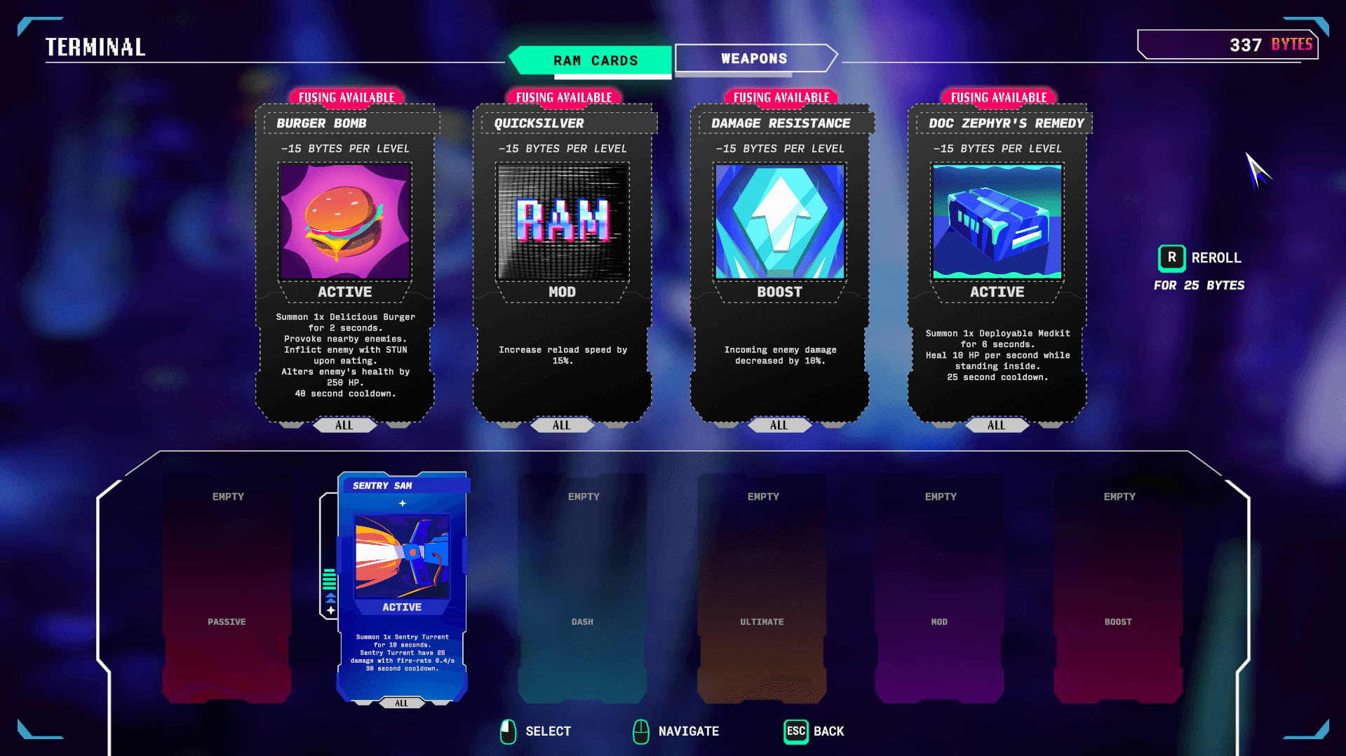 Gameplay-wise, it’s similar to other rogue-lites where you clear mobs, move on to the next stage, and repeat. But what makes it stand out is how the deck-building aspect influences how you approach each stage. After clearing a few levels, you'll encounter a terminal where you can manage your deck, pick up cards, and use Bytes (the in-game currency) to unlock new modifiers, abilities, and boosts. The coolest part? You can now fuse cards together to level up their effectiveness, which makes managing your deck way more strategic.