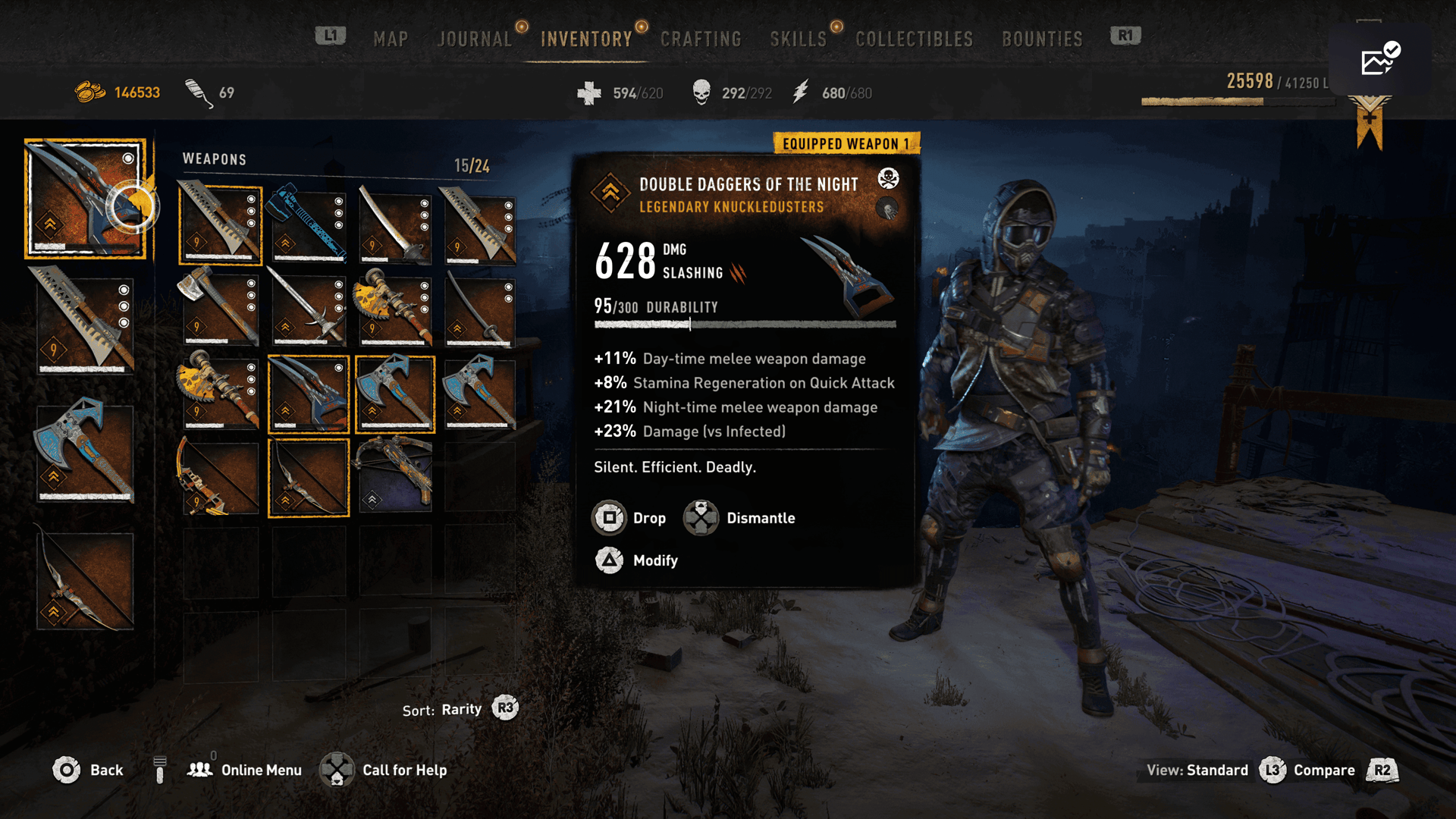 这把传奇单手砍刀提供改造槽和特殊的夜间战斗加成,使其成为夜间僵尸猎人的理想选择。