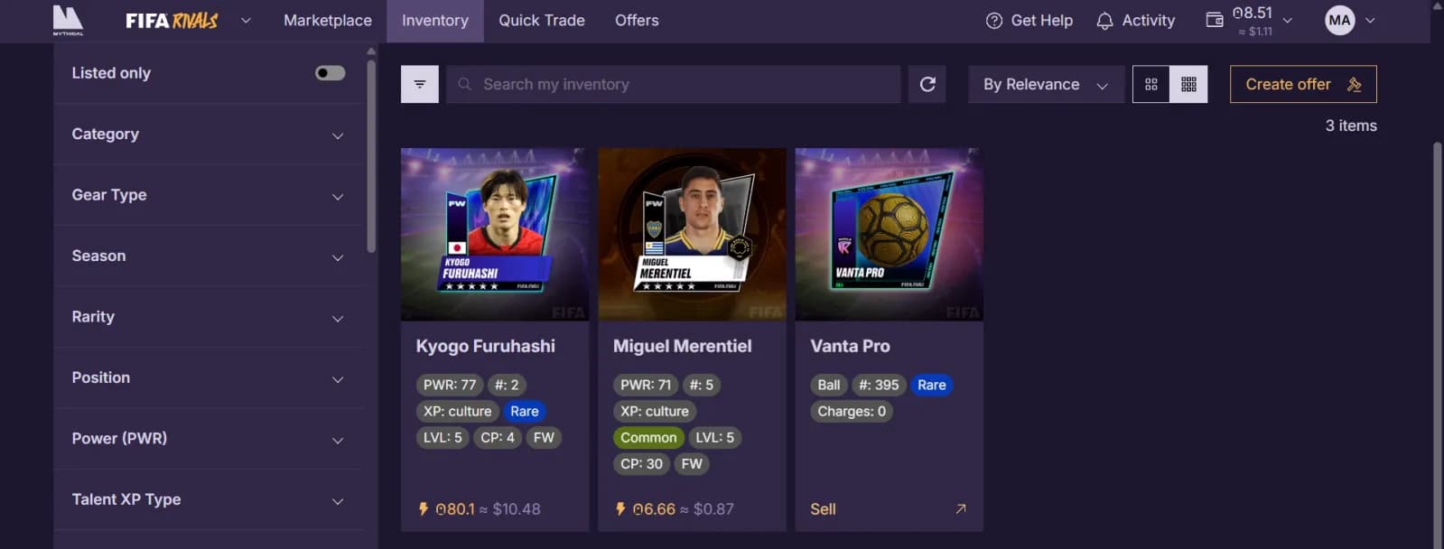 完成这些步骤后,您就准备好了。任何铸造的球员卡现在都会显示在您的 Mythical Marketplace 库存中,在那里可以与其他玩家进行交易。