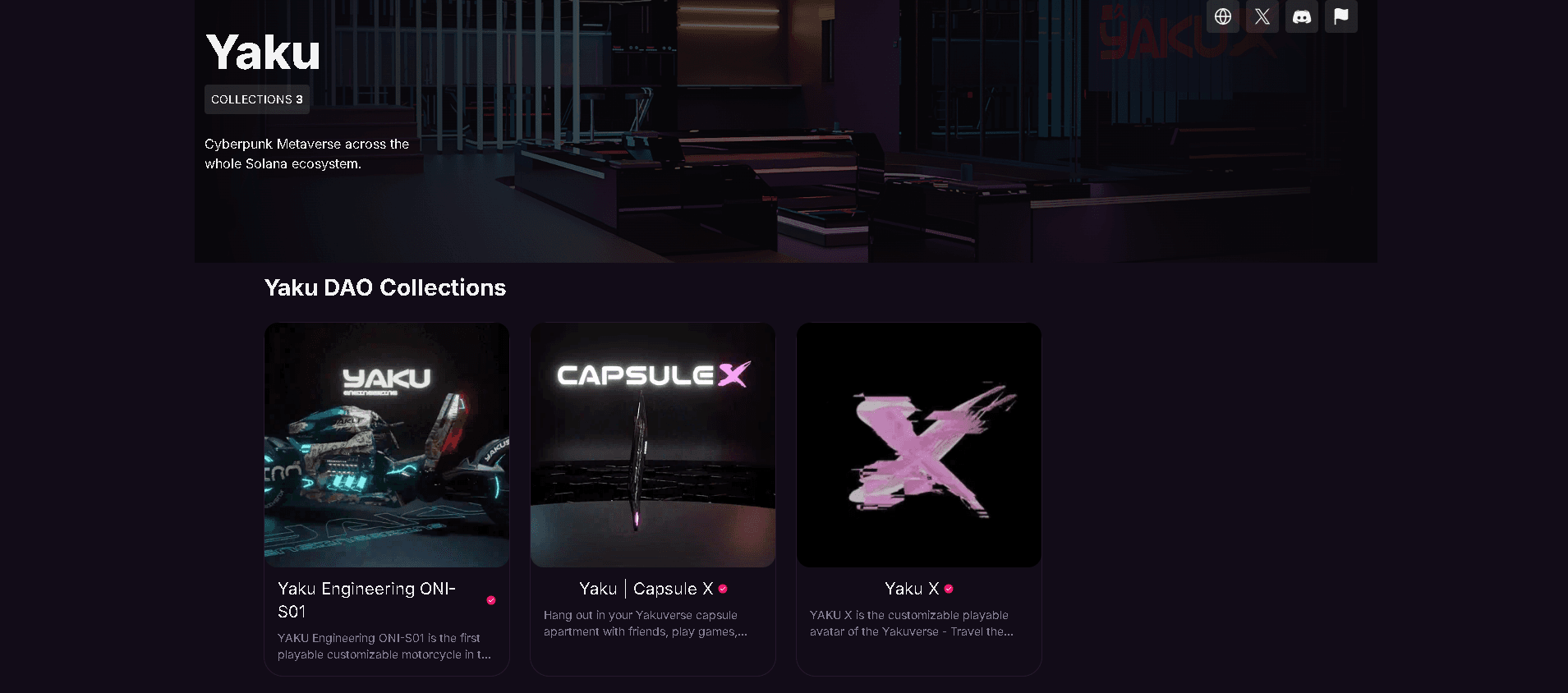 Yaku 利用区块链技术来确保游戏内资产的可验证所有权和透明的交易历史。通过利用以太坊、Solana、Arbitrum 以及最近的 XAI 等多链,Yaku 集成了 Web3 功能,包括用于土地、建筑、头像和装备的 NFT。目前的 NFT 系列包括 YAKU X、CAPSULE X 和 ONI-S01,可在 Magic Eden 上找到。