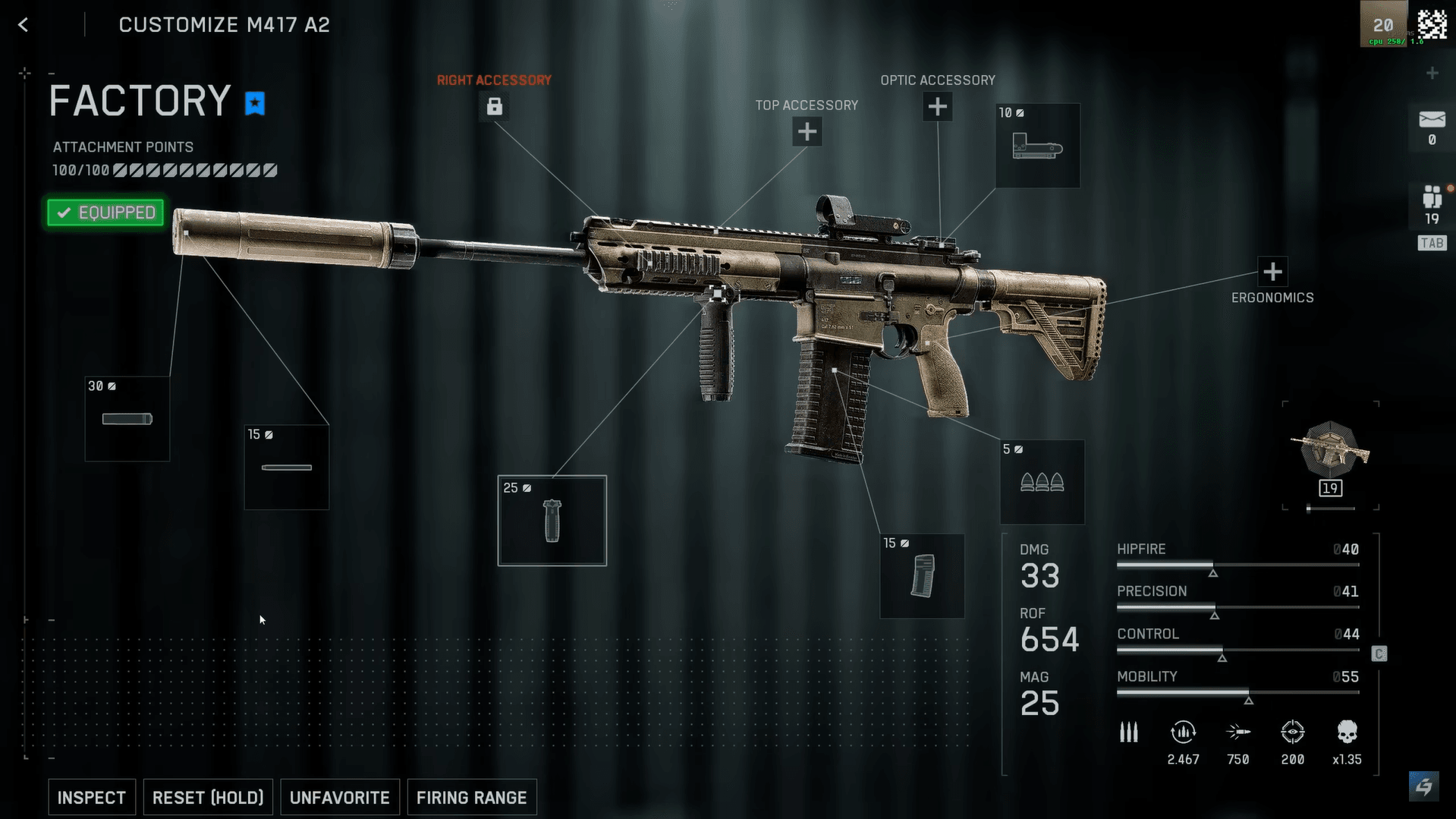 這個配置在近距離能造成33點傷害,在最大射程則降至20點傷害。後座力模式變得極其可預測,垂直上揚極小,水平漂移幾乎為零。