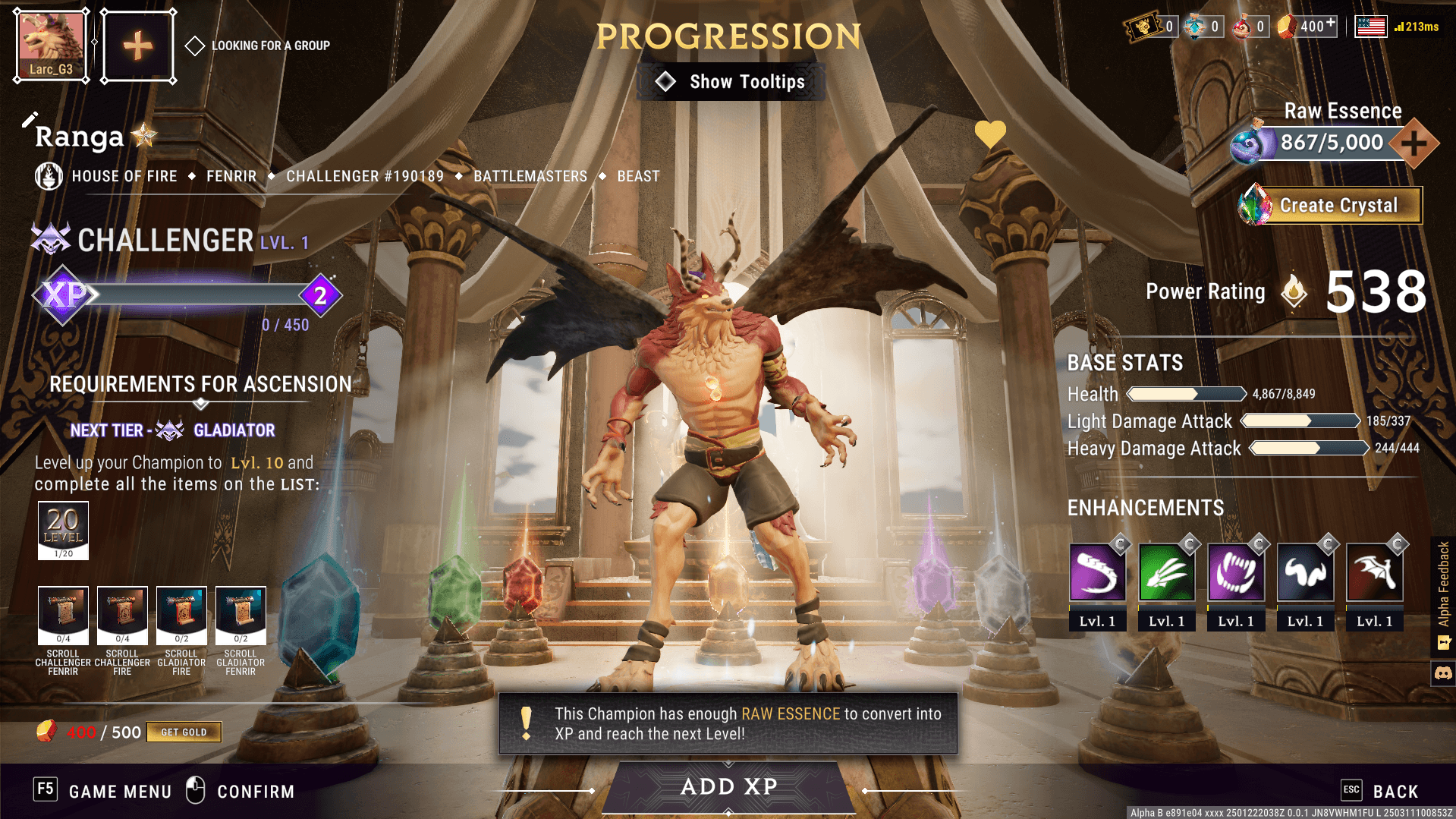 成長系統圍繞著您的英雄的「飛升」(Ascending)展開,這絕對是一場磨練。共有四個飛升階級:新兵(Grunt)、挑戰者(Challenger)、角鬥士(Gladiator)和永恆(Eternal)。要升級,您需要贏得戰鬥並收集經驗值和精華等材料。飛升到下一個階級需要「飛升卷軸」(Scrolls of Ascension)和「精華水晶」(Essence Crystals),這些也可以從商店購買,但您需要大量的金幣才能實現。飛升不僅能讓您的英雄更強大,還會根據他們所屬的元素改變他們的外觀。看著您的英雄在每個階級中進化是成長系統中令人滿意的一部分。