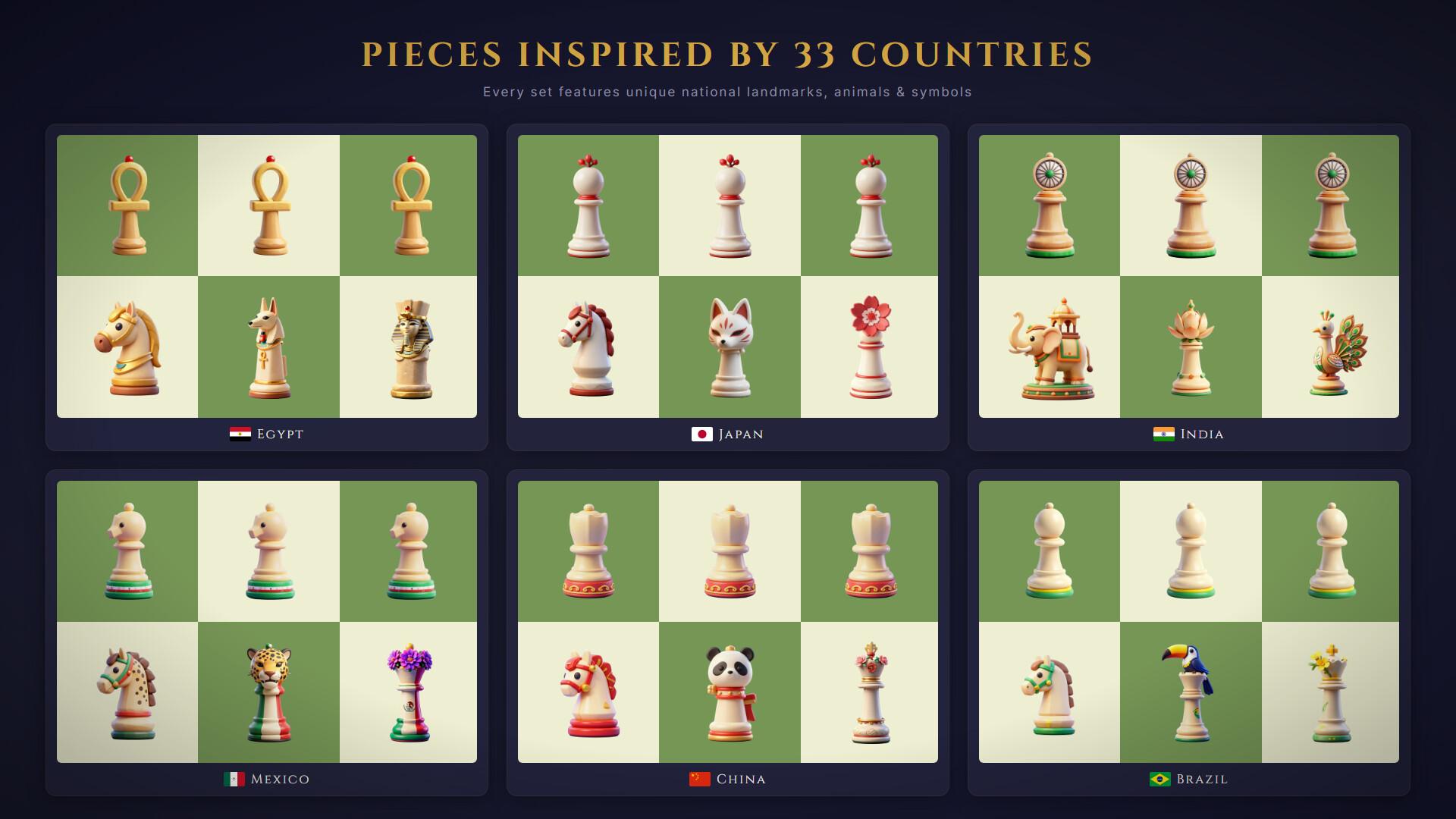 Chess Kingdom 共有 100 個玩家等級,可解鎖的棋子組、棋盤主題、背景和稱號都與實際遊戲進度掛鉤,而非購買。 33 種國家選項各自配備了受文化啟發的棋子設計:印度蒙兀兒風格的棋子組、受日本將棋影響的棋子、荷蘭台夫特風格的棋盤。這是一個獎勵投入時間而非金錢的裝飾系統。
