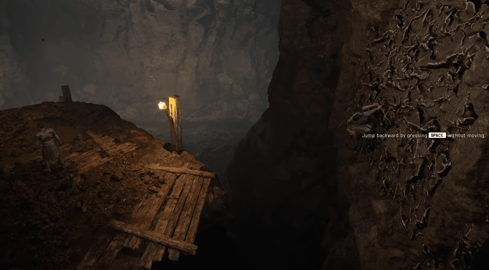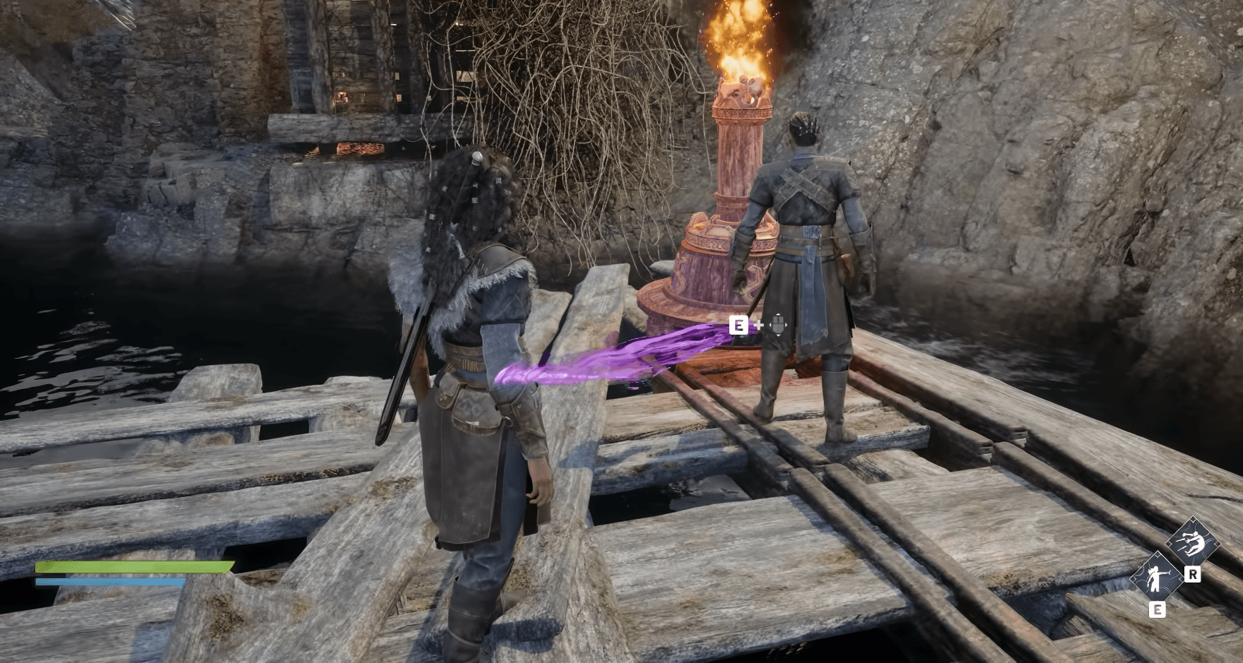 燃燒藤蔓的謎題開啟了新的路徑。使用火把清除藤蔓並放下橋樑後,過橋並立即檢查右側的小房間。