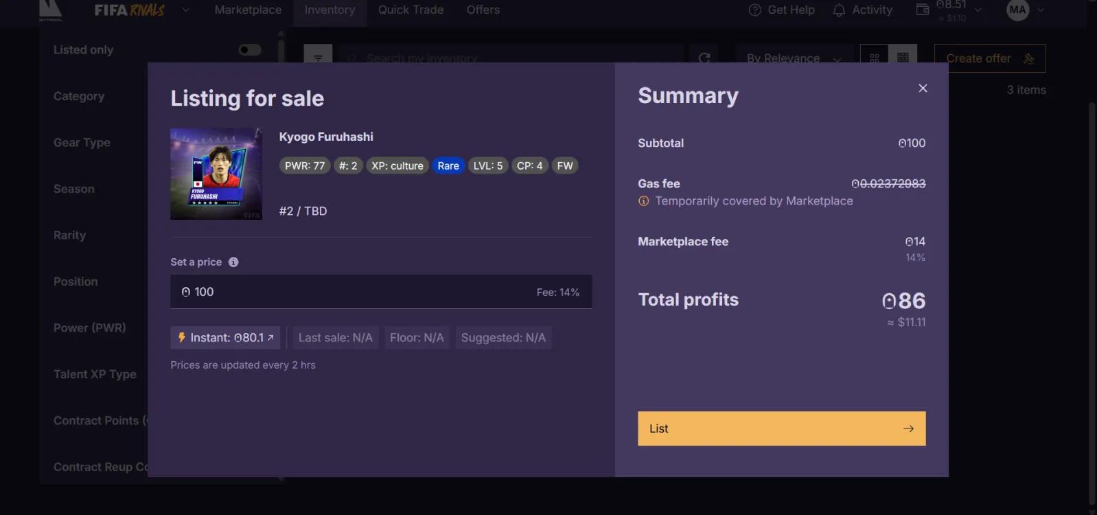 從那裡開始,上架過程非常簡單。前往您的Mythical 物品欄,找到您想出售的卡片,然後點擊上架流程。系統會提示您設定價格——因此最好事先瀏覽市集,看看類似卡片的售價。稀有度、球員能力值、位置,甚至鑄造編號有時都會影響價值,尤其是在遊戲經濟的早期階段。