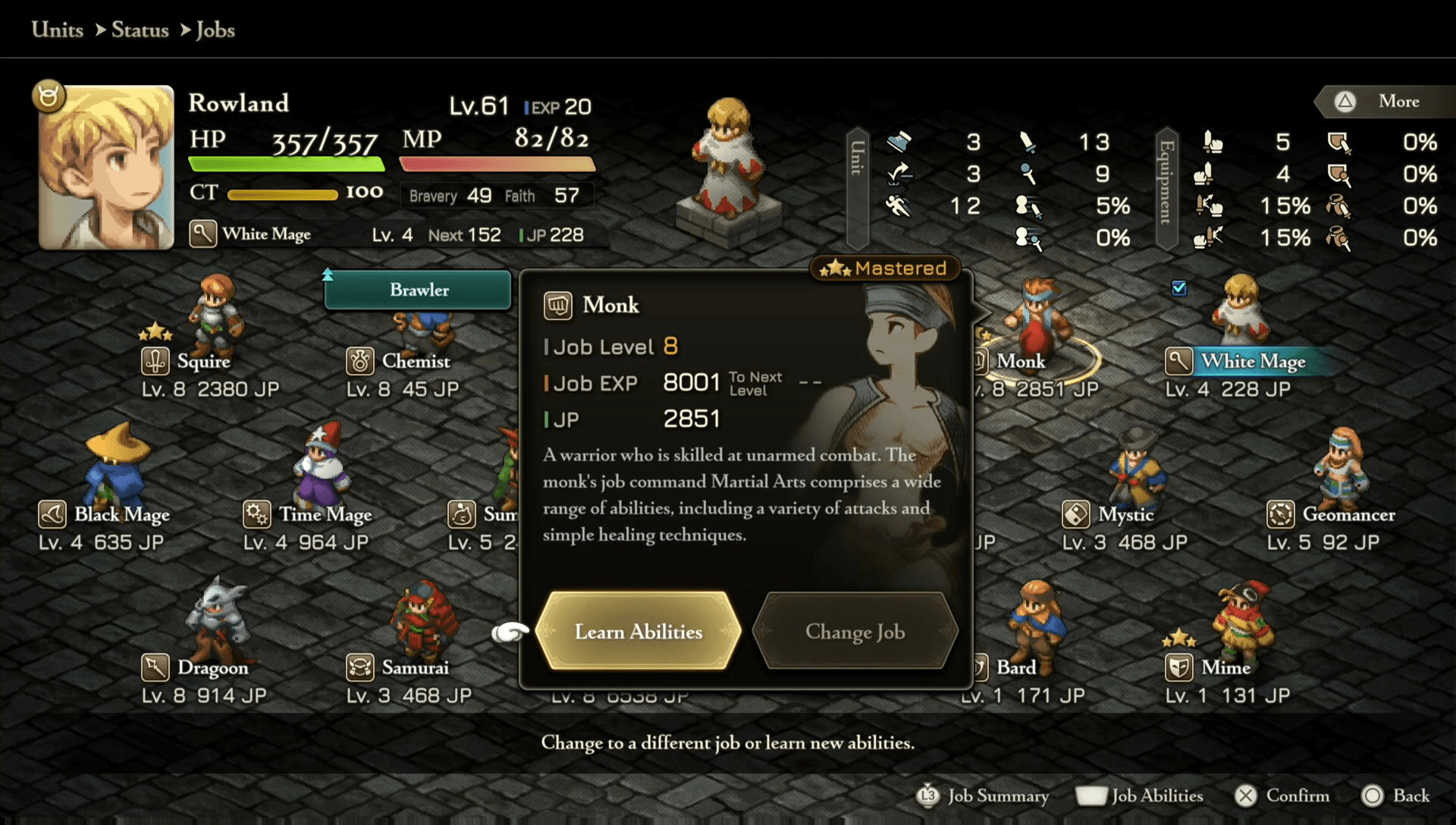 這三個職業構成了任何成功的《FFT Remaster》隊伍的基礎。武僧提供可靠的傷害和生存能力,化學士確保你的隊伍保持健康和功能,而黑魔道士則提供控制戰場節奏所需的範圍傷害。