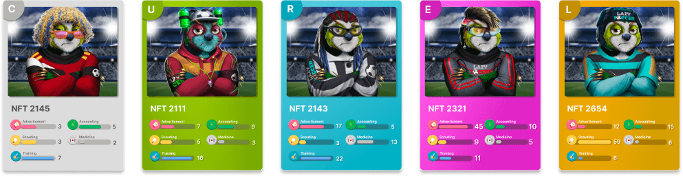 NFT 在《Lazy Football》中扮演著重要角色,為玩家提供了自訂和強化球隊的機會。Lazy Staff 系列包括具有特定技能的角色,如物理治療、教練和會計。這些 NFT 可以分配給建築物,提高其效率。Lazy Alpha 作為創世 NFT 系列,允許繁殖新資產,為開發團隊資源創造了一個動態系統。玩家可以在市場上交易 NFT 和寶石,為組建俱樂部提供了靈活性。