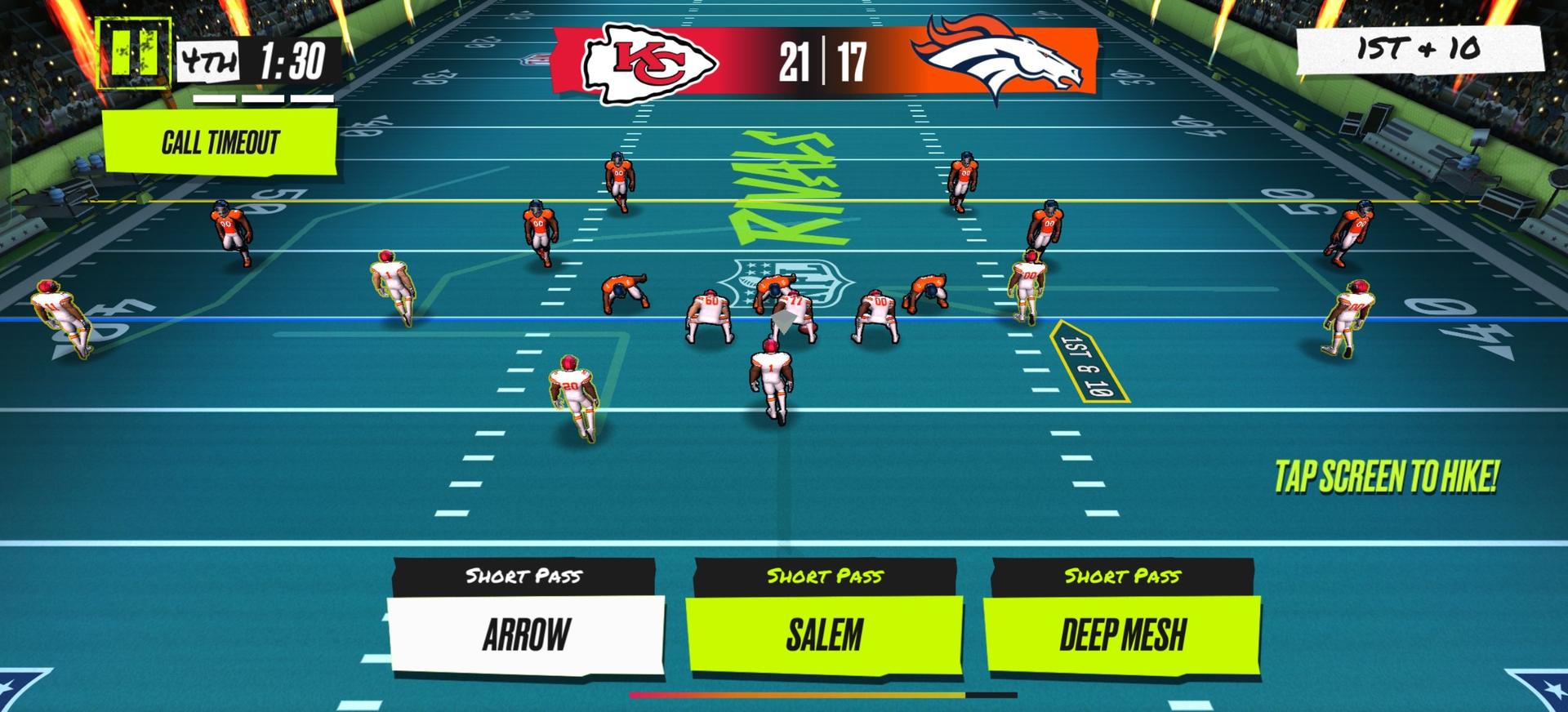 然而,值得注意的是,《NFL Rivals》非常強調進攻玩法。防守方由系統自動控制,限制了玩家的直接參與。在進攻時,你決定要執行哪些戰術,並手動控制你的球員,無論是傳球還是衝刺。遊戲會進行四節,最終由得分最高的球隊獲勝。
