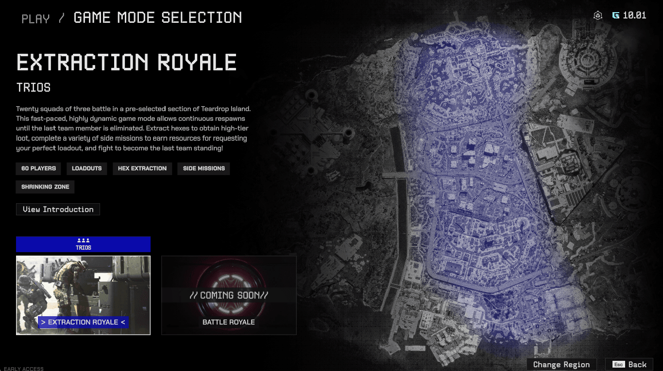 目前,唯一可用的遊戲模式是撤離大逃殺。在此模式中,你將成為三人小隊的一員,被投放到廣闊的地圖中。你的任務是撤離六邊形區域以獲取高階戰利品,完成各種支線任務,並最終成為最後一支存活的隊伍。