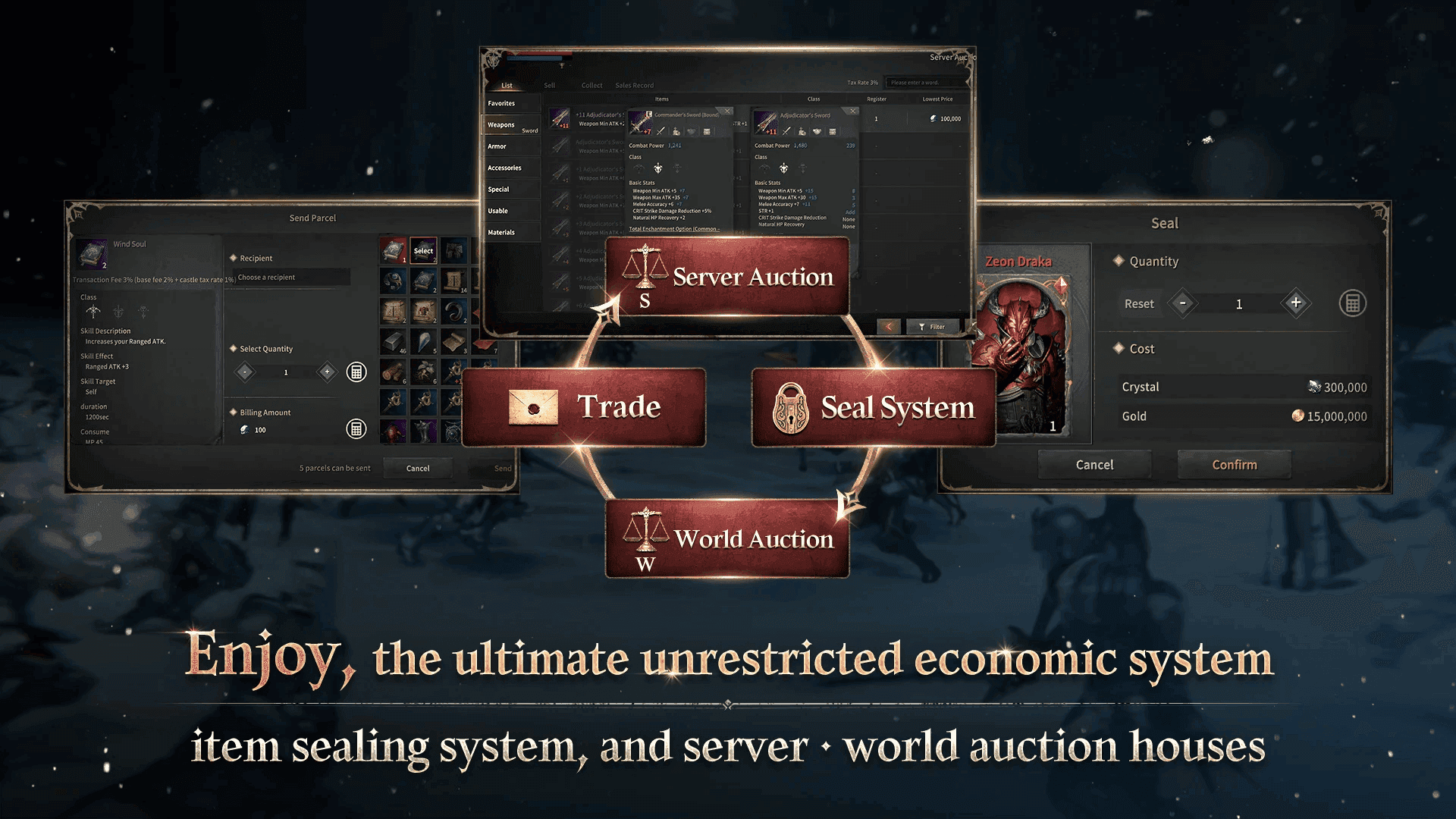 遊戲內的拍賣行也與外部市場連結。被封裝並轉換為可交易資產的物品可以在WEMIX PLAY上架,或透過支援的交易所進行交換。希望透過遊戲探索交易或賺取收益的玩家可以在遊戲內建系統中進行,而喜歡傳統玩法的玩家則可以繼續遊玩而不受影響。